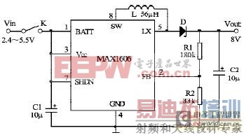 对于采用电池供电的便携式仪表,考虑到电池供电电压的不稳定性,都允许有较宽的电压波动范围。如数字万用表的标称供电电压为9V,实际供电电压在7.5V以上时就可保证其测量精度。由于MAX1606具有稳压功能,对标称供电电压为9V的数字万用表,只要将升压开关稳压电源的输出电压设计为8V就可以了,可延长电池的使用时间。
