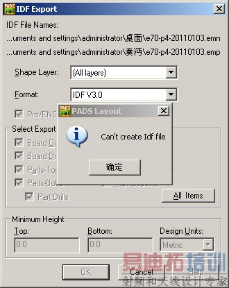 如下图示,在PCBLAYOUT中输出EMN文件时出现如下错误提示,不知如何解决,望遇到过此问题并解决了此问题的朋友给予支持,先谢谢了。