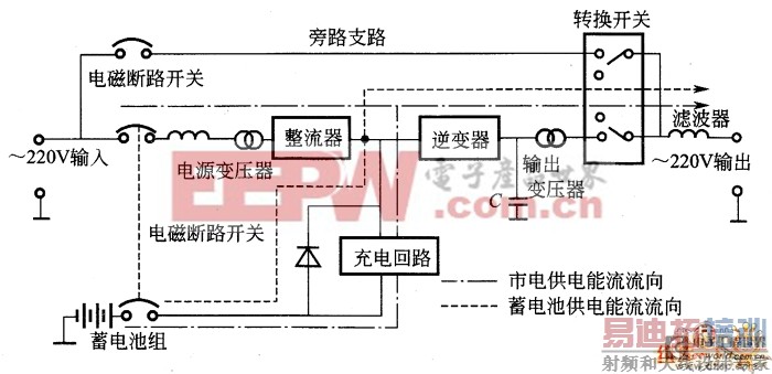 图1为后各式UPS电能流程图。市电供电正常时,市电一方面直接通过交流旁路支路转换开关,经滤波器输出至负载;另一方面通过电源变压器,经整流后变成直流电,再经充电回路向蓄电池组充电。当市电供电中断时,蓄电池储存的电能通过逆变器变成交流电,经滤波器继续向负载供电。