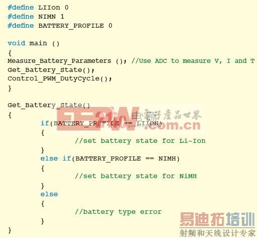 根据测得的参数值以及电池的化学类型,CPU确定出电池的状态,并相应地改变PWM占空比。按传统方法,CPU用于确定充电曲线的条件都是代码中的常数,程序员要手工修改它们(代码清单1)。[p]