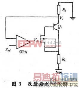 图2中工作电源电压作为电压输入信号,运放担任比较放大的作用,Q1控制调整输出电流Io。Vref为基准电压,它可以是任何一种电压参考源,R0为采样电阻;Vref耐为基准电压;Vr为运放反相端电压;Vo为运放输出电压。根据运放的基本原理,有:
