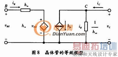 电流iC也由两部分组成,第一项表示由iB控制产生一个电流,因而hfe无量纲;第二项表示由vCE产生一个电流,因而hoe为电导;所以C-E间可以等效为一个受控电流源与一个电阻并联。这样得到的晶体管的等效模型如图8所示。由于h参数方程中的4个h参数的量纲都不同,故称为h参数等效模型。