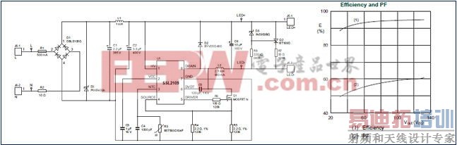 图2.1是一个常规的BUCK降压式线路,芯片是恩智浦公司的SSL2109控制器,原理图上可以看出它的外围元件非常少,电路非常简单,电感只需要一个绕组,不像其它控制器必须依靠另外的辅助绕组给芯片供电,这里它是采用了一颗高压瓷片电容C5,连接到主开关管栅极来进行充电,所以芯片启动后,正常工作的电平都来自于这颗电容的作用。效率方面,它能达到90%以上,不足之处就是功率因数只有0.55左右,如图2.1右侧上的曲线所示。