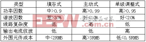 不管是用填谷方式或主动式功率因数校正技术来提高功率因数,都有其各自的优缺点,如填谷式电路中需要使用大容值的高压电解电容,已致于元件成本和尺寸在紧凑型的LED灯设计中存在一定的局限性。两级主动式结构虽然能将功率因数和谐波性能实现得最好,但功率因数校正电路结构较为复杂,使电源的成本和体积增加,由此产生了单级功率因数校正技术,其拓扑是将功率因数校正电路中的开关元件和后级DC-DC变换器的开关元件合并和复用,将两部分电路合二为一。因此单级功率因数变换器有以下优点:1)开关器件数减少,主电路体积及成本可以降低;2)控制电路通常只有一个输出回路,简化了控制回路;3)单级变换器拓扑中部分能量可以直接传递到输出侧,不经过两级变换,所以效率要高于两级变换器。由于以上特点,单级功率因数校正电路在中小功率LED驱动器中优势非常明显。