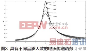 在等式(6)中,Q称为品质因数。发射器线圈或输出电阻改变会影响Q值。在无线充电器系统中,工作点设置在谐振频率上。发射器谐振频率和接收器谐振频率始终相同。因此谐振频率上的电压传递函数值(ωn=1)就是我们感兴趣的。图3 说明系统电压传递函数相对于Q值改变。