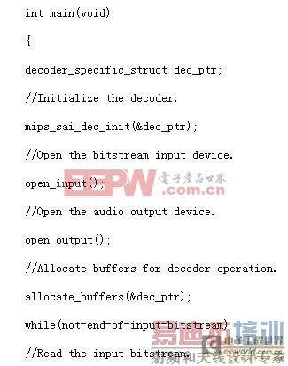 MIPS SAI可提供解码器和主程序,或高级控制和运算监控解码器RTOS之间的接口功能和结构。这种接口为访问控制解码器运算和访问状态和差错信息参数提供了机会。该接口可执行三个基本功能:一个是对解码器进行初始化,第二个是阅读帧标题,第三个实际上是进行解码处理。所有的解码器都具有与特定解码器有关的预确认字段数据结构。解码器对所有的帧进行阅读和结构更新。在帧开始或结束时,主程序可访问数据结构,阅读状态或改变控制参数。参考下面的代码实例,它说明了驱动程序的运行情况。MIPS SAI的功能用粗体字表示。