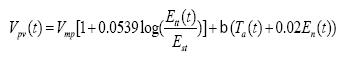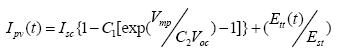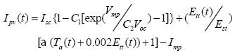 式中,Ipv,Isc分别为太阳能电池输出电流和短路电流,Voc,Vmp,Imp分别为太阳能电池开路电压,最大功率处的电压及电流,Ett,Est为太阳能日照强度和参考强度,α,β为太阳能电池温度系数和电压温度系数, Ta为环境温度[8]。