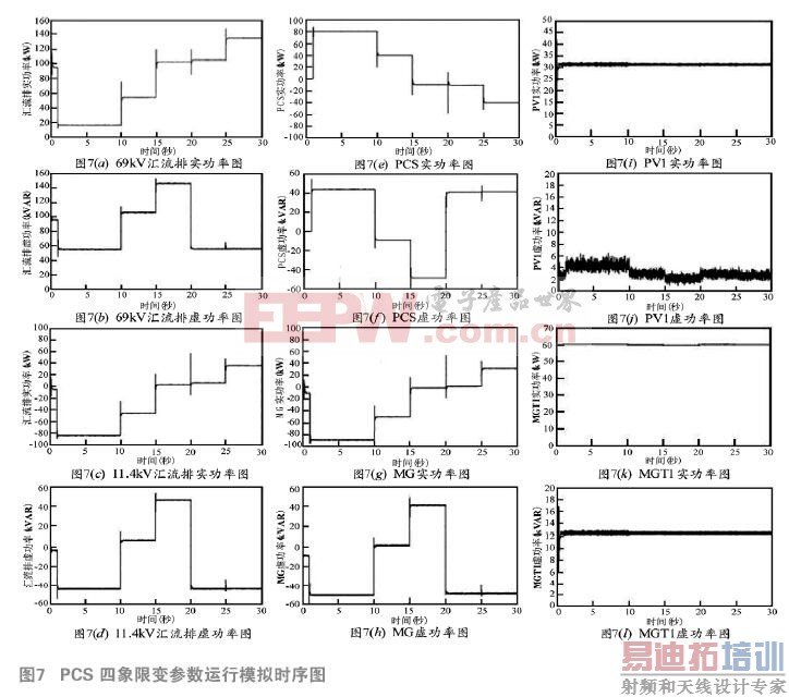 图7为模拟时序图,0秒时所有系统组件均连接到系统,此时PCS在第Ⅰ象限运行,实功率为正,虚功率也为正。10~15秒时PCS运行在第Ⅳ象限,实功率为正,虚功率为负。15~25秒时PCS运行在第Ⅲ象限,实功率为负,虚功率为负。25~30秒时PCS运行在第Ⅱ象限,实功率为负,虚功率也为正。