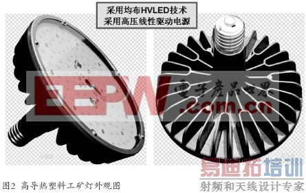 高导热塑料工矿灯采用由高导热塑料为主体全塑料或塑包铝散热的系统结构套件,和集光电一体于一块铝基板上的光电引擎组成。图2是高导热塑料工矿灯外观图,右侧图是带散热鳍片的高导热塑料散热器;左侧图是集光电一体的光电引擎。光电引擎采用不需要变压器、不需要电解电容器、不需要电感器的高压线性恒流驱动电源;采用均布HVLED的光源灯珠布程设计技术。光电引擎上的LED灯珠、高压线性恒流驱动电源芯片、整流桥堆、贴片电阻电容均可一次在SMT上自动贴片生产,生产效率高,节省人工。