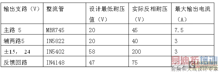 整流管必须选择恢复速度高的肖特基整流管,具体的选择是依据各路的输出电压水平和输出电流容量,整流管的额定工作电流至少为该支路最大输出电流的三倍以上,管子的反向耐压也需要在最低耐压值的基础上留够裕量。具体方案如下表所示: