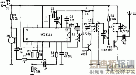 MC2831A及外围元件所构成的单片集成调频发射电路如图所示。MC2831A工作电压为3~9V。晶体SJT的频率在22~30MHz之间选取。L1 线径为0.1mm高强度漆包线,在高频骨架上绕制30匝,电感量约为10uH。L2骨架相同线径0.12mm高强度漆包线,初级为10匝,3匝处抽头,次级4匝。L3用0.55mm高强度漆包线绕成内径6mm,8匝的空心线圈。天线FX用1~2m拉杆天线。该电路发射距离可达200m以上,其不足是不加射频放大级时输出功率较小,不利于远距离的传输。