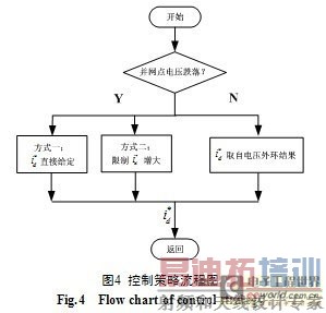 图中,控制器检测并网点电压是否跌落,若电压跌落,则断开电压外环,在电流内环直接给定输出不过流时的id值作为参考值,可用正常运行时id=1作为参考值,也可以用小于1的值作为参考值从而减小id,降低有功功率输出;另一种方法是用逆变器正常运行时的id=1作为限制值,通过限幅环节限制住i*d的增大,从而限制住id的增加。若检测到电压没有跌落,则i*d继续取自电压外环计算出的结果。