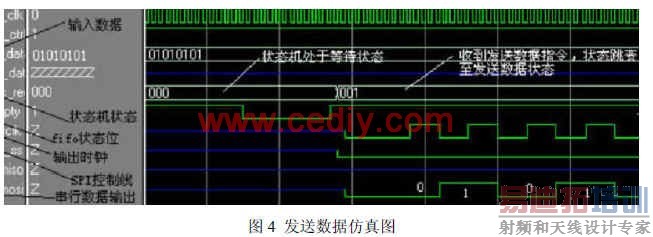 将用 vhdl描述好的 SPI接口电路用 synplify进行综合,然后用 modelsim软件进行仿真。先仿真微处理器通过 SPI接口发送数据过程,在地址总线上输入指令寄存器地址,在数据总线上输入发送数据指令,工作时钟为89.6M,然后在地址总线上输入写数据寄存器地址,在数据总线上输入数据 01010101。得到如图 3所示的部分管脚的波形。