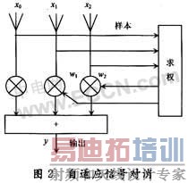 在自适应信号处理中,DSP要根据一定的算法,从实测数据中估算出权值,然后DSP把这种自适应权与数据合成,得到期望的输出。图2是一个自适应对消原理图,在3路数据中都含有期望的信号和要抑制的干扰,其中各路的干扰是相关的,而信号的相关性很弱,信号与干扰不相关。自适应算法就是从3路数据中取来一批数据作为样本,按最小二乘法则,将3路数据合成,使得合成输出中干扰基本上被消除,而信号仍较强。为了使信号不随干扰一起被对消掉,希望在求全样本中无信号。