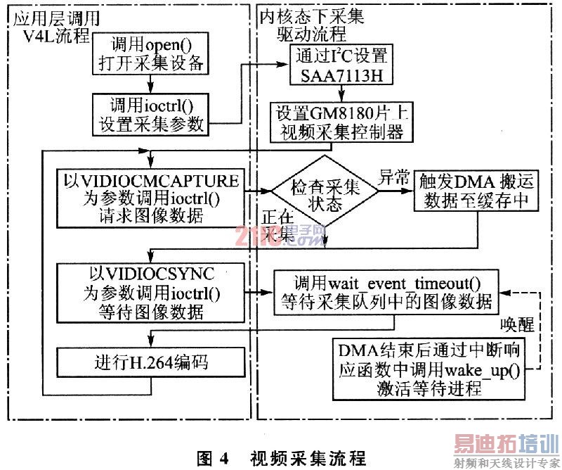 当应用程序以VIDIOCMCAPTURE标志调用ioctl()函数时,驱动检查采集控制器和DMA状态,如果当前是正常的采集状态,则ioctl()系统调用返回;如果当前不是正常的采集状态,则重新触发采集控制器和DMA。当应