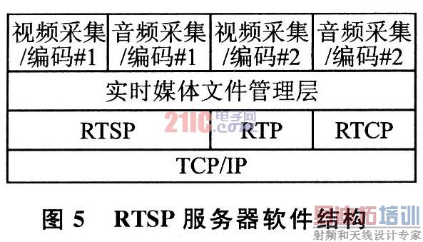 如图5所示,RTSP服务器软件设计为分层结构,采用socket网络编程和pthread多线程技术实现。系统设计一个单独的线程用于监听RTSP端口以及进行RTSP会话的信令交互处理,这样的设计保证服务器能够对每个客户连接作出快速的响应。当一个RTSP会话成功建立之后,服务器将为该会话分配一组RTP/RTCP端口以及相应的缓冲区,同时创建一个新的线程用于负责发送RTP和RTCP报文以及接收、分析客户端反馈的RTCP接收者报告。在RTSP、RTP、RTCP协议实现和音视频编码器之间设计了一层实时流媒体管理层,通过它将音视频采集和编码驱动的初始化、采集数据、编码以及在运行过程中更改采集或者编码参数(如更改码率、帧率、请求编码关键帧)等操作抽象成统一的实时媒体文件接口。