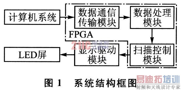 LED显示系统主要由计算机系统、数据通信传输模块、数据处理模块、扫描控制模块、显示驱动模块和LED屏构成,如图1所示。