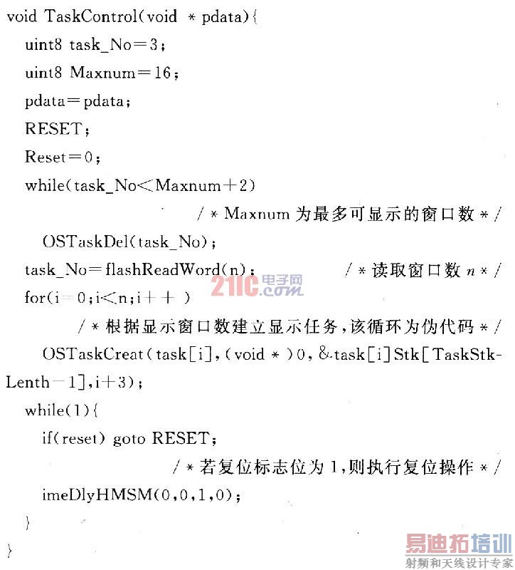基于以上数据结构,软件设计的流程如图5所示。系统首先进行初始化操作,然后从Flash中读取显示屏参数,进行参数初始化。接着建立任务TaskControt(),其优先级比各窗口显示任务都要高,主要用于实时管理各窗口显示任务,每个窗口的显示由单个窗口显示任务来控制。窗口显示任务根据各窗口显示方式的不同,在其对应的part存储区域进行下一帧数据的处理运算,然后调用窗口显示子任务进行显示。在完成一帧数据的显示后,调用一次OSTimeDlyHMSM()使当前任务进入等待状态,下一个优先级最高并进入了就绪态的任务,立刻被赋予了CPU的控制权,由此完成窗口显示任务之间的切换。任务TaskControl()定期查询Reset是否有效,若有效则删除原来建立的任务,重新读取窗口数,建立新任务,启用各个窗口显示任务Task_i。