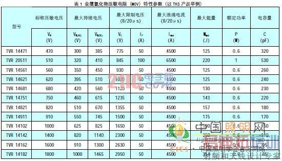 金属氧化物压敏电阻(MOV)的电压-电流特性见图3,金属氧化物压敏电阻(MOV)特性参数见表1。气体放电管(GDT)的电压-电流特性见图4,气体放电管(GDT)特性参数见表2。
