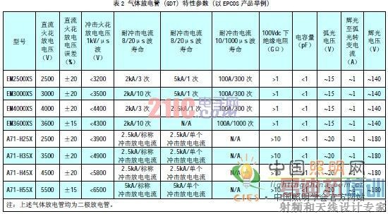 为了使 LED 路灯能够满足安全要求,气体放电管的耐压选择至关重要,应该选取足够耐压的气体放电管与压敏电阻配套,压敏电阻和气体放电管串联电路(如图1)应能够承受基本绝缘的耐压。几种气体放电管的直流火花放电电压和交流击穿电压的关系见表3,气体放电管的直流火花放电电压一般应选不低于2500V。