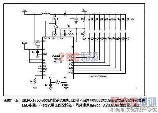 对于较小型的显示面板,就可以使用LED矩阵来取代CCFL背光,不过使用多个LED串也会带来相对的设计挑战,其中最明显的是如何能够在整个区域提供一致的照明与色彩输出。推动LED背光矩阵的一个方式是采用内含8个LED驱动通道,分别可以提供55mA电流输出的MAX16807与MAX16808,请参考图4(a),图4(b)则显示了采用MAX16807的典型电路如何简化系统,只需少数几个元件就能够完成背光驱动子系统的设计。