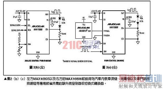 所有这些汽车内部灯光应用都可以采用LED作为光源,虽然地图灯与车顶灯通常可以使用一颗高亮度LED来解决,但仪表板灯与车门踏板照明灯则通常需要超过一个LED串联形成的光源,之所以采用串联连接方式主要是为了避免不同LED间的电流不同造成颜色差异。所有应用都必须要有内建明暗调整功能的定电流电源,而拥有这些功能组合的一个例子为美商美信(Maxim)公司的MAX16800,这款芯片整合了所有的控制以及电流供应电路,请参考图1(a)。