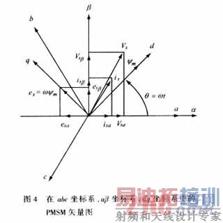 图4为PMSM主要变量:Vs、is、es、Ψ以综合矢量和其分量的形式在静止αβ坐标系,和旋转dq坐标系中的表示。式(7)为PMSM的数学模型: