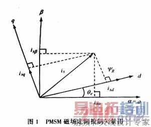 这样电磁转矩只随|i1|和角δ变化。为了获得简单可控的转矩特性,可以给定定子电流综合矢量指令使其始终在q轴上,即δ=90°,从而得![]()
