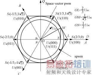 对于三相电压源型逆变器的6个开关管,用“1”和“0”分别代表上下桥臂的开、关状态,则开关信号共有8种组合, U 1(100), U 2(110), U 3(010), U 4(011), U 5(001), U 6(101),以及 U 0(000)和 U 7(111)。这8种组合,在复平面上,分别产生8种电压向量,如图1所示。其中 U 0及 U 7为零向量,6个非零向量构成了图中的六边形,并将六边形分为6个扇区。图中所示六边形内切圆和略小的同心圆分别表示SVPWM和SPWM的直流电压利用率。空间电压矢量法即是通过选取同一扇区中相邻两个非零矢量和适当的零矢量来合成一个等效的空间旋转电压矢量 U ref(该电压向量在空间上理想轨迹是一个圆),调控 U ref的频率、幅值和相位,即可实现逆变器输出电压频率、幅值和相位的控制。设 T 1及 T 2分别为同一扇区两相邻非零向量 U X 及 UX ±1,在同一个采样周期中对应的作用时间, T 0为零向量作用时间,由SVPWM的原理可得式(1)。