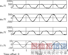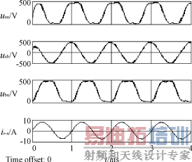 图8及图9分别为感性负载下两种优化模式在1000Hz输出时的仿真波形。其中 u an及 u bn为经过一阶 RC 滤波后的相电压波形, u ab为 RC 滤波后的线电压波形, i s-a为对应电流波形。由仿真波形可见,采用开关优化模式1时,相电压为典型的马鞍波形,其对应的线电压、线电流谐波含量很小,不过在一个采样周期中开关次数较多。而采用优化模式2时,相电压中出现了微小畸变,使得输出线电流谐波含量增加,但是它的开关损耗仅为前面的67%,这将有利于高频逆变器向更高的控制频率发展。可见二者各有优缺点。