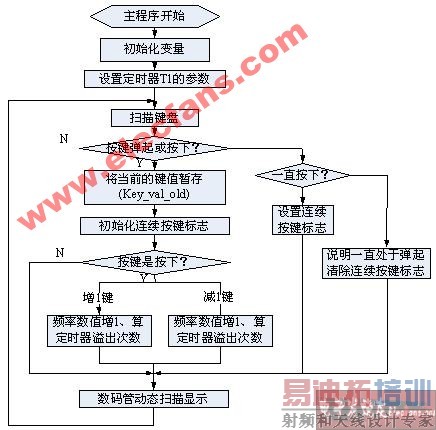 系统的整体思路:主程序在初始化变量和寄存器之后,扫描按键,根据按键的情况执行相应的功能,然后在数码显示频率的值,显示完成后再回到按键扫描,如此反复执行。中断程序负责方波的产生、按键连续按下超过2S后频率值以10Hz/s递增(递减)。