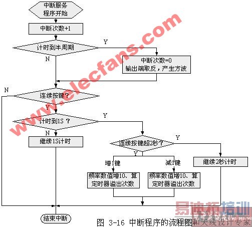 单片机内部资源分配:定时器T1用来实现方波的产生和连续按键的计时功能,内部变量的定义: hz_shu:设定的频率数; T1_over_num: 根据设定频率计算后的定时器溢出的次数值; T1_cnt:定时器溢出次数;sec_over_num: 计时1s的定时器溢出的次数;second:连续按键的计时;state_val:连续按下的标志 0=按键已经弹起;1=按键一直按下;led_seg_code:0-9数字的数码管7段码。主程序和中断服务程序如图3-15,3-16所示。