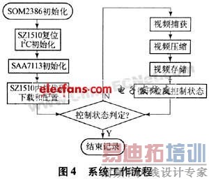 系统上电后,som2386初始化音视频编码模块,系统正常启动后,saa7113对输入的复合视频信号进行解码,生成ccir-601数字视频流,ak4550采集输入的模拟音频信号,生成pcm数字音频流,分别送入压缩编码芯片sz1510,压缩成mpeg-1系统流后,在som2386控制下以文件形式存储到电子硬盘。
