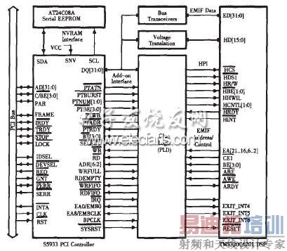 在DSP与上位的PC机之间有2种PCI桥可供选择,一种为主模式PCI桥,如AMCC S5933。主模式下,DSP与上位机之间可以相互访问对方外围设备,并且支持突发方式的数据传送,缺点是要通过中间的粘合逻辑相连,不能直连。另外一种为从模式PCI桥,如TI 2040。从模式下,上位机可以访问DSP的外围设备,而DSP则无法访问上位机外围设备。从模式桥可以与DSP直连(无缝连接)。在本文的设计中,选用了主模式的PCI桥,在DSP与PCI桥之间通过一片CPLD进行粘合。