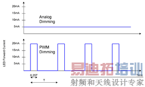 在了解 LED 驱动器的诸多高级特性以前,您首先必须了解降低 LED 亮度的两种方法:模拟调光方法和脉宽调制 (PWM) 调光方法。模拟调光方法是指改变流经 LED 的正向电流。利用一半的电流驱动 LED 可降低一半的亮度。尽管并不是绝对的 1:1,但是 LED 亮度会随着正向电流的变化而高度线性地变化。