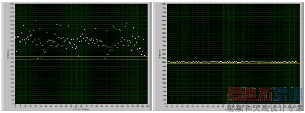 一个典型的 LED 驱动器(如:TLC5946 等)利用单个电阻 Rset 设置每个输出的最大 LED 电流。点校正使用模拟调光方法来调节电流至该最大电流的某个百分比。DC 校正位数越大,最终 LED 亮度匹配也就越紧密。一个 6 位 DC 具有 64 离散电流水平,其从 0mA 到 Rset 电阻定义的最大电流。这样便可提供 1.59% 步长的正向电流。一个 7 位 DC 具有 0.79% 步长的正向电流。图 2 显示了一个成品面板点校正前后的亮度水平。