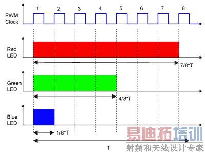 脉宽调制 (PWM) 亮度调光或灰度 PWM 调光,可消除调光 LED 相关的色彩改变。这种调光将精确 LED 色彩保持在低亮度水平,其为产生高质量视频的关键。无论 LED 的亮度水平如何,都要保持流经 LED 的恒定电流,这样 PWM 调光方法便可消除 LED 色彩改变。彩色显示器的每个像素都产生自三种 LED:红色、绿色和蓝色。通过同时脉冲和混合红色、绿色和蓝色LED,像素便能够产生高达 687 亿种颜色。下列举例说明了 PWM 调光方法。