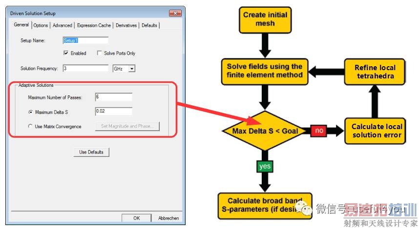 首先程序会对仿真目标进行一个粗略的网格剖分(大量的小四面体),并进行有限元近似求解,同时计算出每个剖分单元的近似误差(因为对电场是近似求解),然后计算出目标频率响应(例如S参数)。按道理说,结果已经得到,仿真就可以结束了,但是HFSS说不行!还要进一步验证当前仿真的精度,为此HFSS选择那些近似误差较大的剖分单元进行加密,然后重新仿真计算,再次得到新的目标频率响应,并与上次的仿真结果进行对比,如果两者结果相差较大(例如相对误差大于2%),说明上次网格剖分质量还有待提高,因此需要加密网格剖分,继续验证对比,直到仿真结果趋向一致,这就是所谓的自适应网格剖分技术。