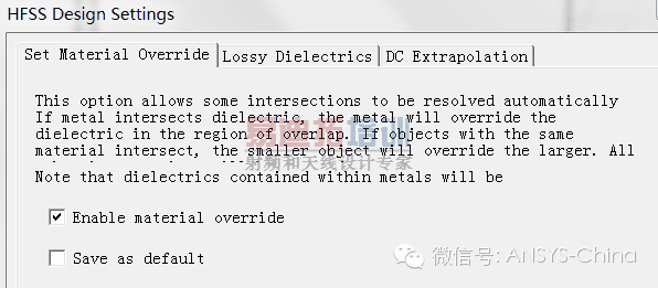 2. 如果是异类属性的材质(如金属和介质),有部分交叠时,可在HFSS菜单中HFSS-> Design setting中勾选Enable material override选项,如图1.21(c)所示。此时金属物体将优先占据与其交叠的介质区域,3D model check通过。