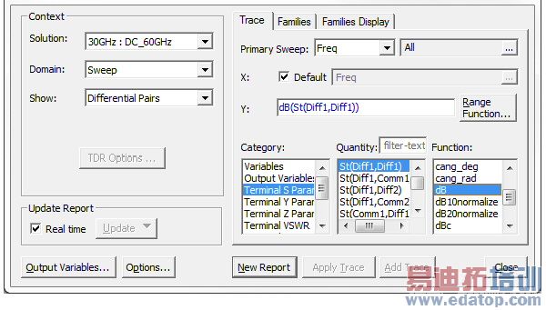 When the design has differential pairs (link), the reporter can display quantities for the defined pairs or for the single-ended terminals upon which they are based. A pull-down menu will appear in the Context area of the Report creation dialog which allows the user to select which quantities will be displayed.