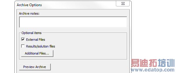 External Files: selecting this checkbox will cause all external files to be included in the archive. The External Files checkbox refers to any existing files associated with the project, such as linked files, or files added through the Project>Insert Doumentation File command or Project>Data Set command.