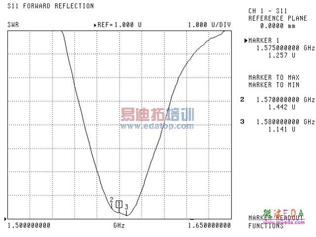 在上述仿真设计的基础上,加工了天线实验样机。经调试后,对共形阵天线的主要电性能进行了实测。采用矢量网络分析仪对天线的电压驻波比和输入阻抗进行了测量,结果如图11、 图12 所示。可见,所设计的共形阵天线在所要求的频段内,电压驻波比小于1.5,且圆极化性能良好。