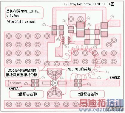 频率超过2~3GHz必需谨慎选择印刷电路基板的材质,基本上不可使用传统FR4玻璃环氧树脂,因此无铅且高频特性与FR4玻璃环氧树脂相同的高Tg玻璃环氧树脂使用可能性大幅增加。一般而言高频电路通常会选用高频用低tan的基板材质,此外为抑制周围温湿度造成高频特性变动,因此必需将基板的温湿度一併列入考虑。图30是频宽50MHz~6GHz宽频高频增幅器的电路基板图案,如图所示micro strip line上方的2个耦合电容C1、C2与C4、C5, 并联设在线路端缘(edge)可以改善insertion loss与return loss等高频特性。