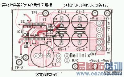 如图40(b)所示,BIC221C内部方块图所示第4,6号脚架的GND,与第8号脚架的P.GND1、第16号脚架的P.GND2明确分隔,如果按照图40(a)电路图指示,直接描绘含盖上述脚架配线图案的话,可能会造成误动作与噪音增加等后果,因此设计电路基板图案时,必需将第8号脚架的P.GND1、第16号脚架的P,GND2分开,避免第4,6号脚架GND大电流流动。具体方法如图41所示,GND的第4,6号脚架在元件面连接,P.GND1的第8号脚架再与銲接面连接,大电流从C5通过P.GND2的第16号脚架,再从Vout(11,12,13,14pin)通过L1流入C5,P.GND1的第8号脚架从C1设置slit作连接,因此连接与第4,6号脚架的GND的图案不会有大电流流动。