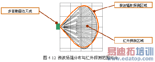 图4-11是一种双鉴探测器中使用的24.125GHz专业级波导谐振传感器。图4-12是该传感器场强分布,可以看出与红外探测范围近乎拟合。