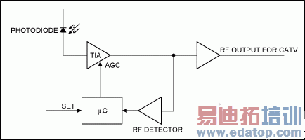图1.典型的CATV应用中,利用模拟反馈环路的RF控制器调整TIA增益。