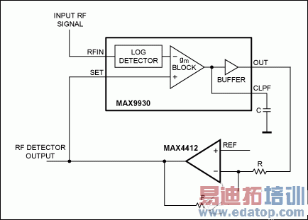 图5.配合MAX4412反相放大器,MAX9930 RF控制器构成RF检测器。