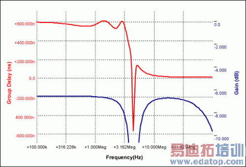 图2. 图1所示陷波器和群延迟补偿电路的增益和群延迟频响