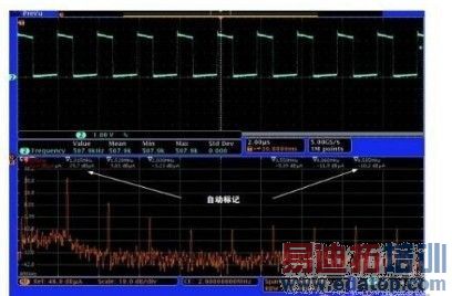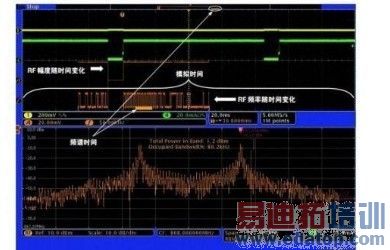 画面的下半部分显示了RF信号的频域视图,在本例中是射频发射机输出,画面的上半部分是时域的传统示波器视图。频域视图中显示的频谱来自时域视图中短橙色条指明的时间周期,称为频谱时间(Spectrum Time)。