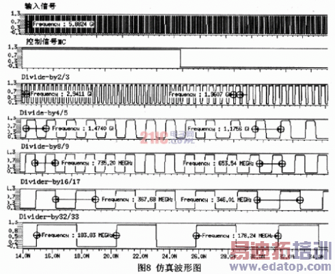 采用TSMC90nm CMOS工艺,电源电压1.2V,使用Mentor公司的Eldo软件对本设计进行仿真,仿真结果显示,输入频率为5.8GHzH寸,电路功耗仅为O.8mW。